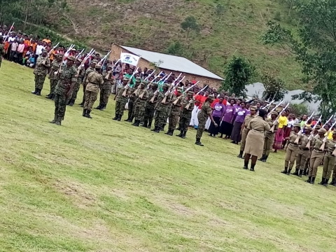 the prime minister of Uganda the Rt Hon Robinah Nabanja is welcomed by the pared for both the UPDF and UPF in Buhweju District, celebrated on 29th April 2022.